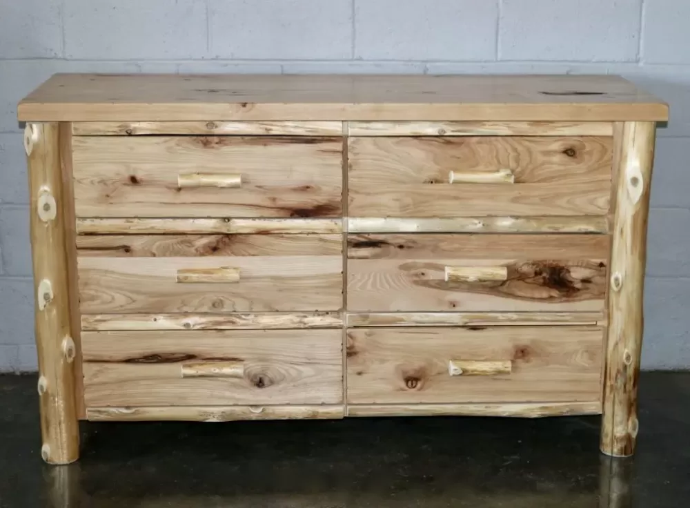 This dresser is made with a 2″ thick hickory top and hickory drawer faces with northern white cedar legs and drawer pulls. It features six fully extending drawers rated for 100 lb. At 3 feet tall it’s the perfect height for a log wrapped mirror.