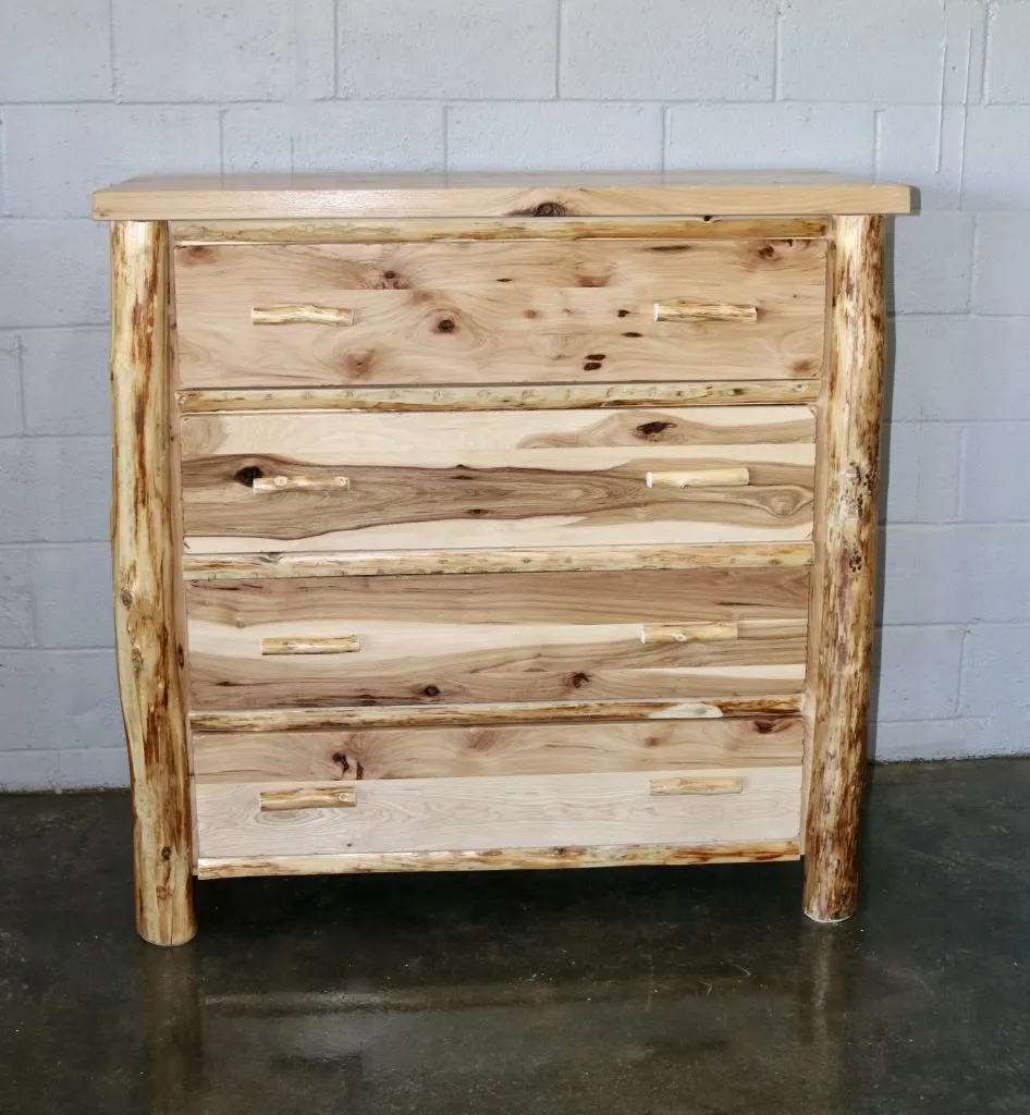 This chest is made with a 2″ thick hickory top and drawer fronts with northern white cedar legs and drawer pulls. It features four fully extending drawers rated for 100 lb. At 4 feet tall it’s the perfect height for your bedroom TV. It is available in two widths to accommodate different room sizes.