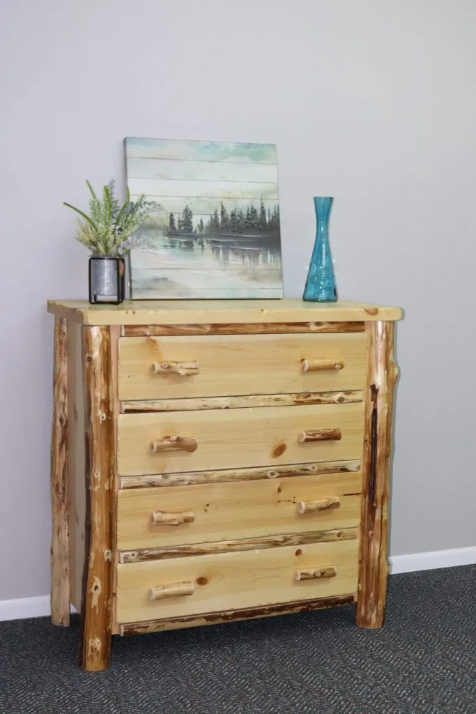This chest is made with a 2″ thick white pine top and drawer fronts with northern white cedar legs and drawer pulls. It features four fully extending drawers rated for 100 lb. At 4 feet tall it’s the perfect height for your bedroom TV. It is available in two widths to accommodate different room sizes.