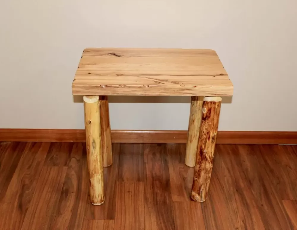 Perfect for a bedroom nightstand or a living room end table, this piece features a 16″ x 24″ hickory top with northern white cedar log legs. It can be made with or without a bottom shelf.